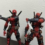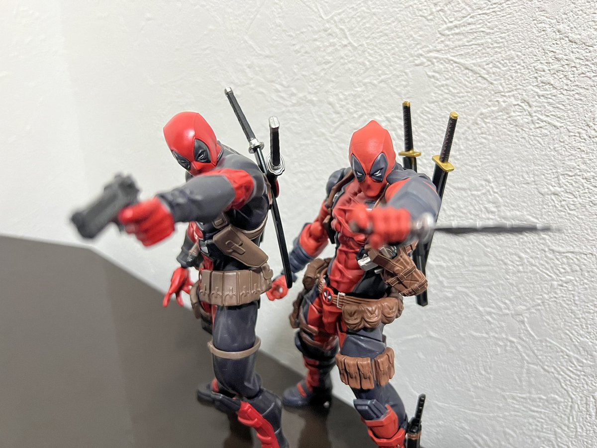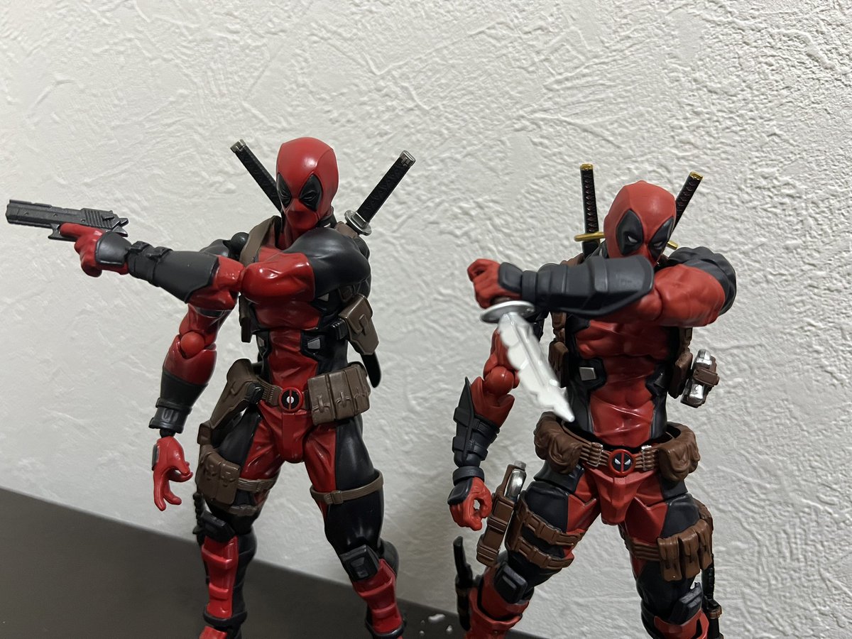 アメイジングヤマグチデッドプール新旧比較。 2.0はよりマッシブでディテールや塗装も緻密に。 2.0はジョイント以外完全に艶消し 肩は動かした時のラインがより自然。 首回りも1.0は付け根からは前後にしか可動しなかったけど2.0はボールジョイントで自由自在。