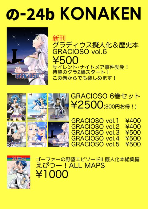 冬コミ、来れる方はよろしくお願いいたします。 1日目(12/30)西「の」24bでございます~。 #C99 新刊のGRACIOSO vol.6を出せるよう頑張ります・・・。