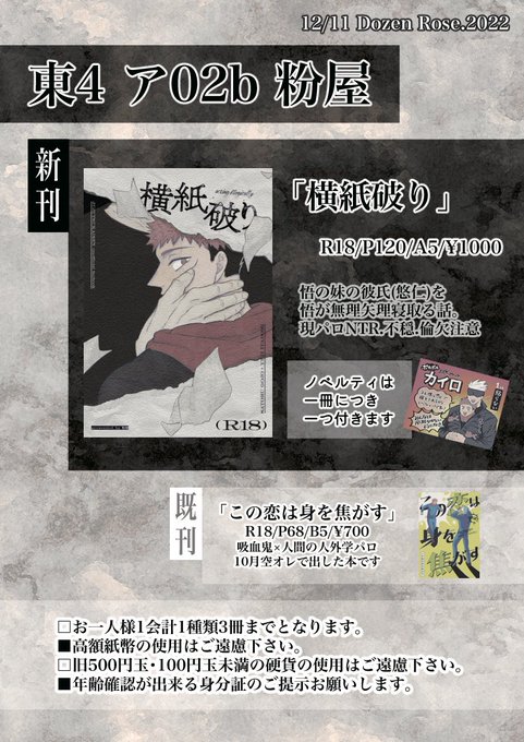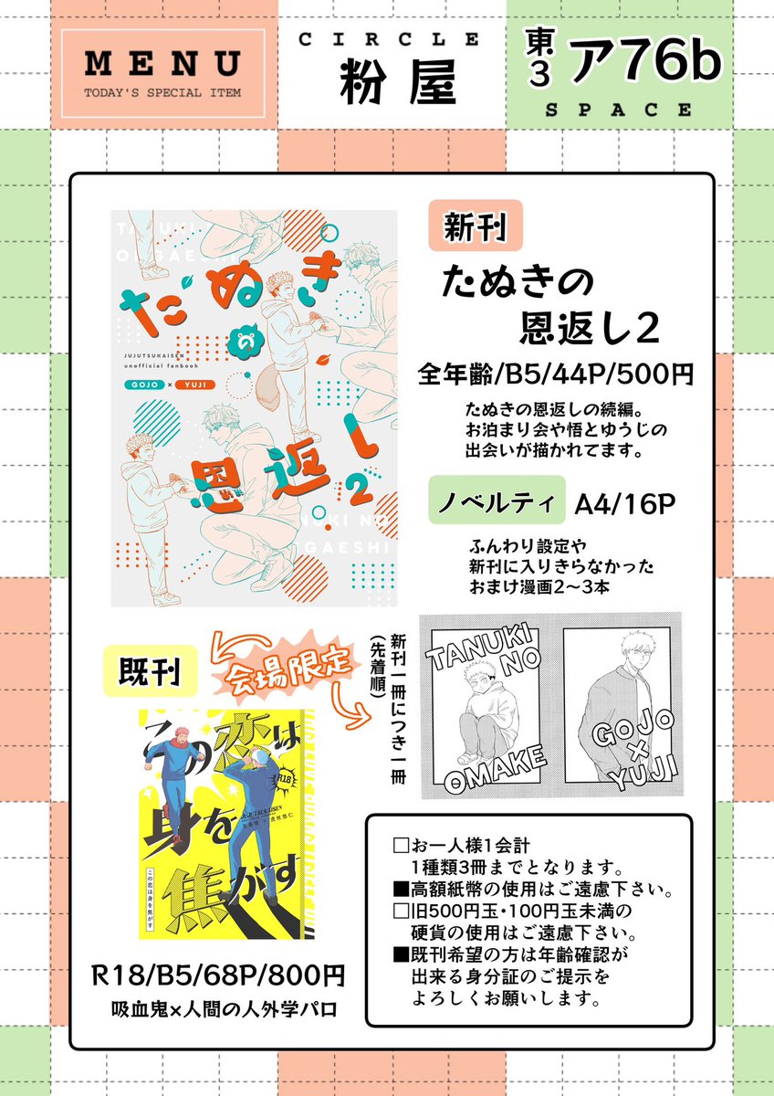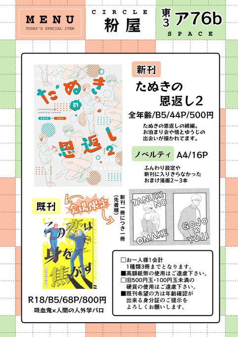 3/19 超妖言 東3ア76bにてスペース頂きました!よろしくお願いします!! 新刊サンプル『たぬきの恩返し2』pixiv.net/artworks/10618… 既刊サンプル『この恋は身を焦がす』pixiv.net/artworks/10156… 全文公開『たぬきの恩返し』pixiv.net/artworks/10580… 通頒ページ→ecs.toranoana.jp/joshi/ec/secre… twitter.com/konaki____/sta…