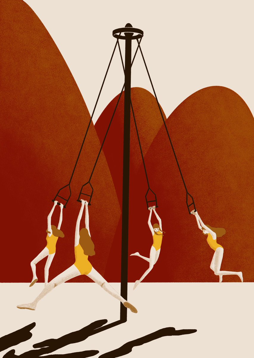梅田蔦屋書店の個展で展示中のアクリルガッシュ作品。 「遊び」をテーマに描いています。 公園の平均台や道路の白線でバランスとってる時、ここはめっちゃ高いところ!とか下はマグマ!とか想像して、落ちたら死ぬ!の気持ちで遊んでたな〜って思い出して描きました🔥 個展見にきてね🦀