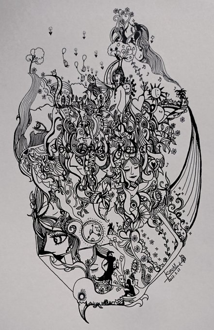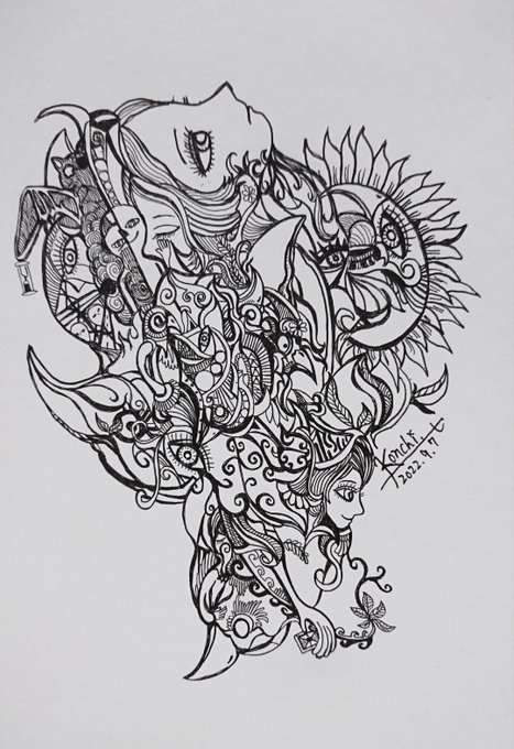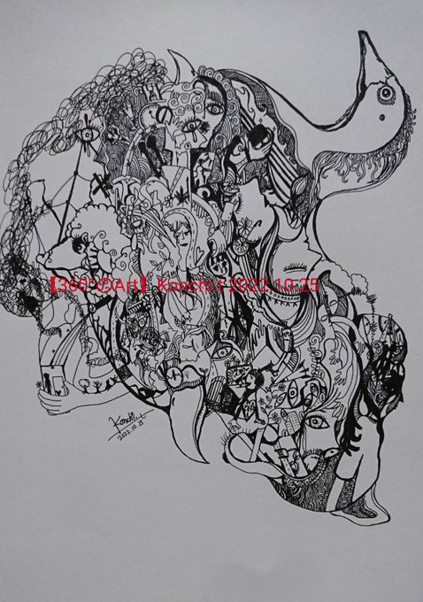 9 51 おはようございます🍀 今回は原画をそのまま 加工無しで 専門的な知識はありませんが 1人でも多くの方に絵を知って頂く事で次に繋がる何かの ステップになるといいな~ 【360°のArt】新作 題名「回して見る絵」2022.9.6 ボールペン A4画用紙 #絵 #落書き #Art #イラスト #拡散 #新作 #Konchit 22/09/06 05:20