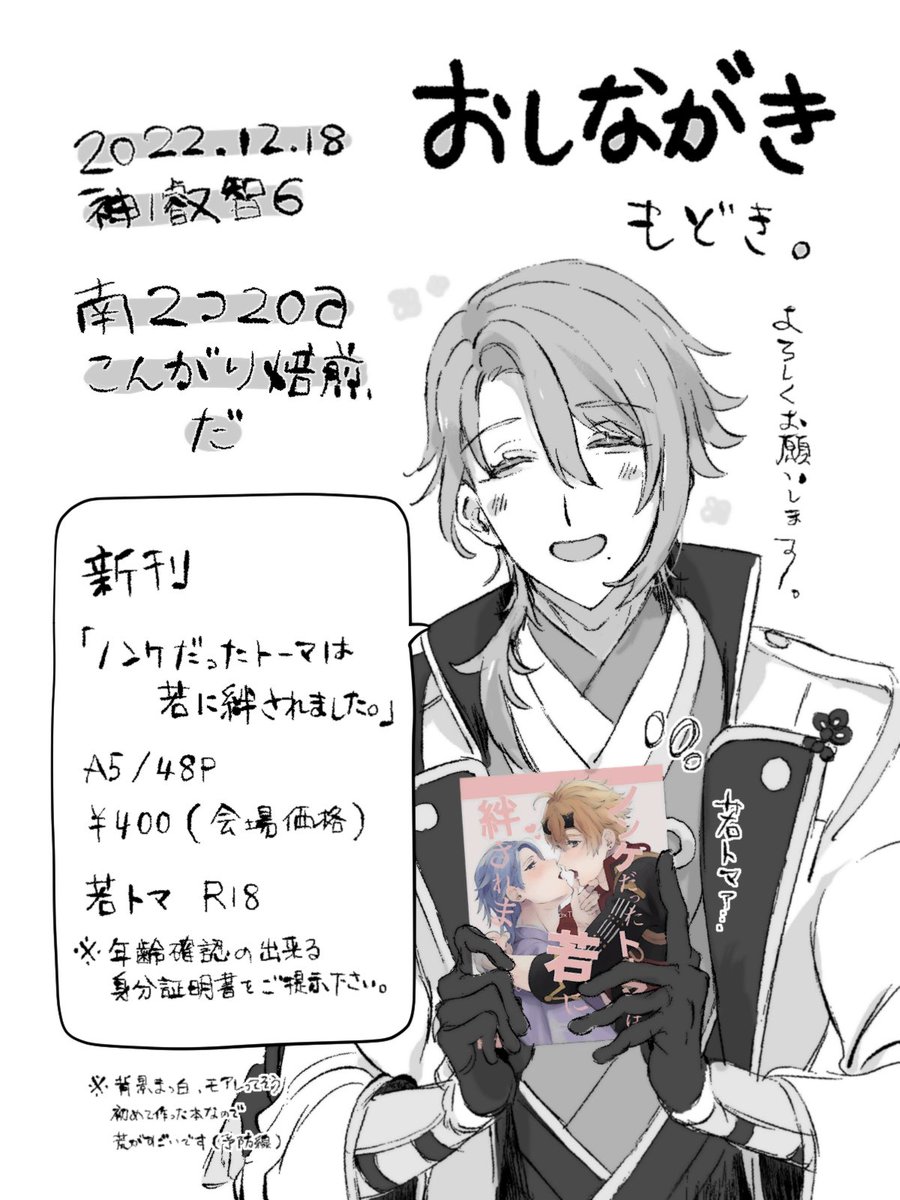 12 29 【12/18 神ノ叡智6】新刊サンプル【若トマ】 | たたた pixiv.net/artworks/10358… よろしくお願いします(ウルトラ小声)(多分出ます) 22/12/14 00:24