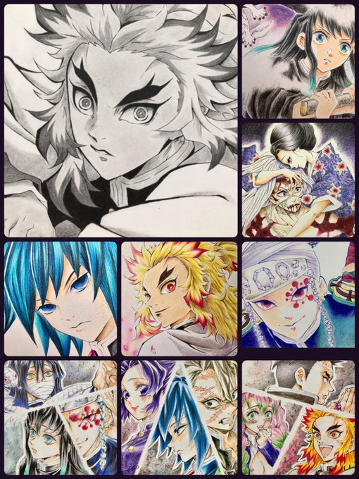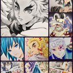 #今月描いた絵を晒そう 左上は鬼滅の塗絵帳です