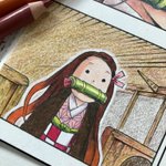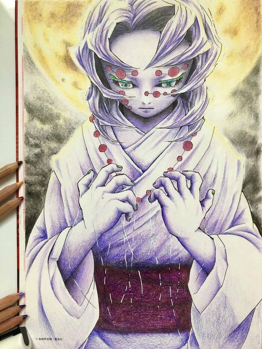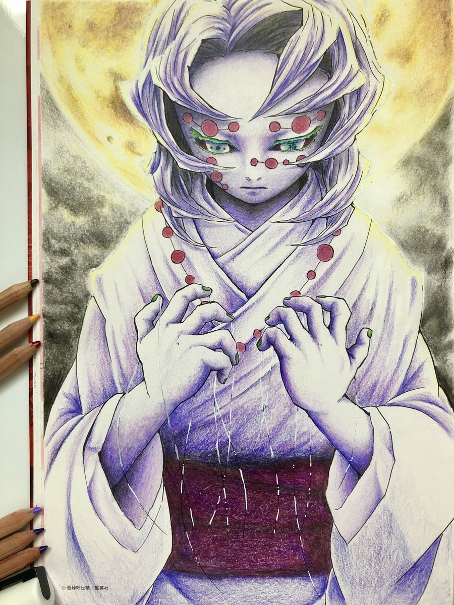 昨日は中秋の名月🌕 鬼滅の刃塗絵帳-紅-P29 もともと背景は白でしたが月を描いてみました #ぬりえ #色鉛筆