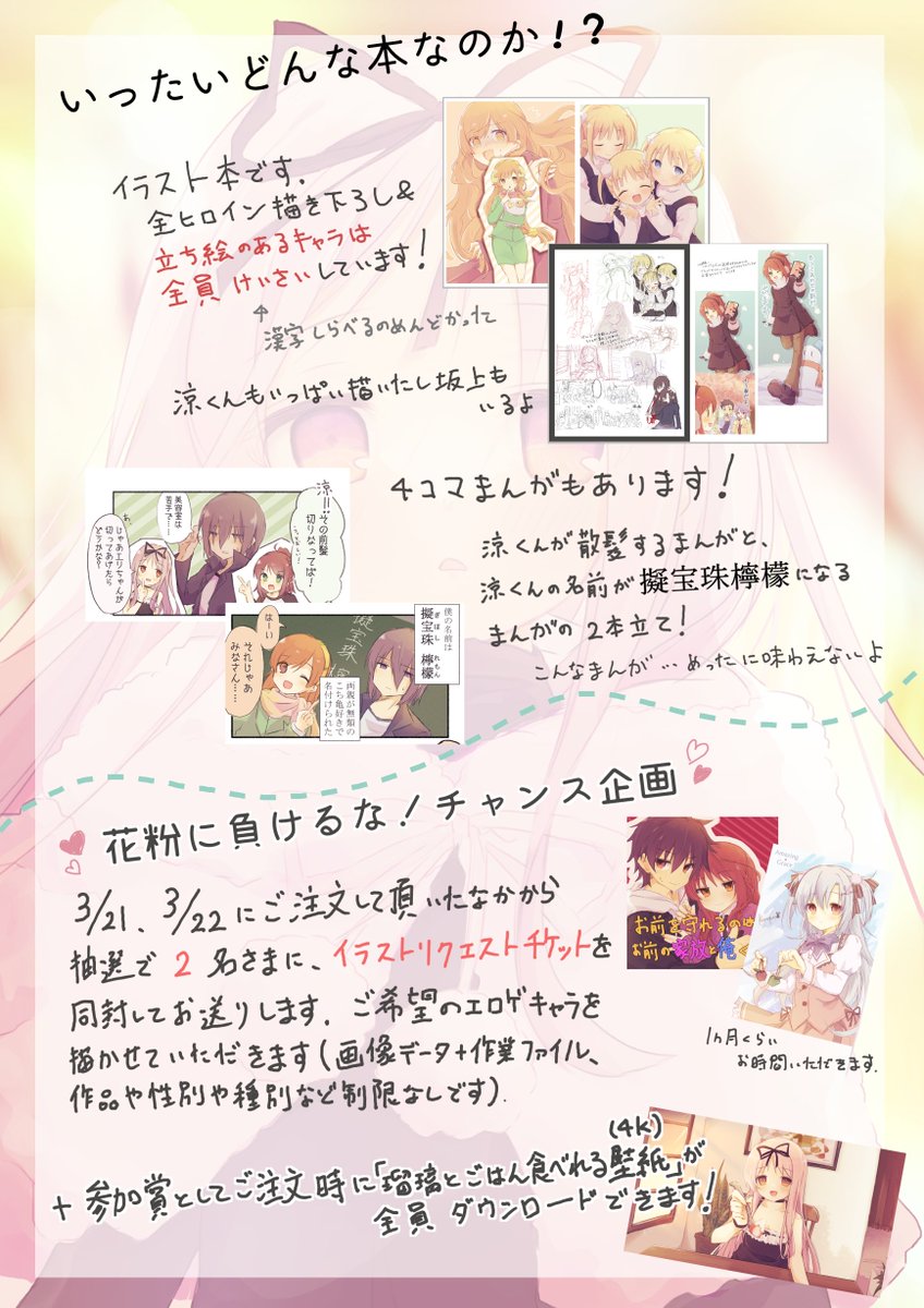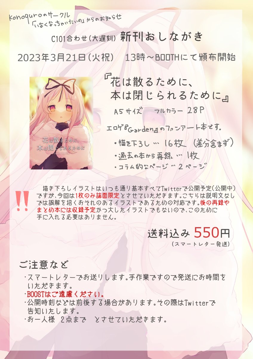 お品書き! Gardenファンアート本『花は散るために、本は閉じられるために』、3月21日(火祝)13時からBOOTH(konoquro.booth.pm)にて受付開始予定です A5フルカラー28P 送料込み550円です 恒例のチャンス企画もやります、前回同様イラリクチケットです