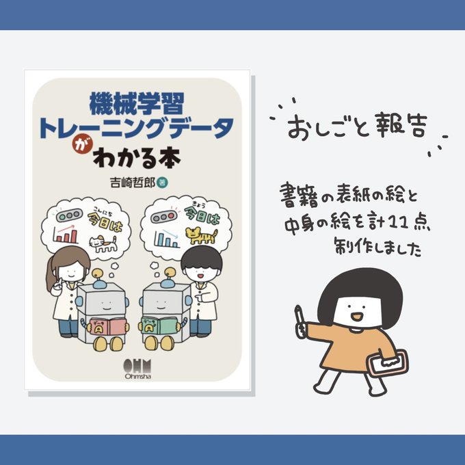 【お仕事したよ】 オーム社様より出版の「機械学習トレーニングデータがわかる本」のイラストを描かせていただきました! ネット予約が開始してますので、興味のある方はぜひチェックしてみてください✨ ohmsha.co.jp/book/978427423… #さかもとこのみのおしごと #機械学習トレーニングデータがわかる本