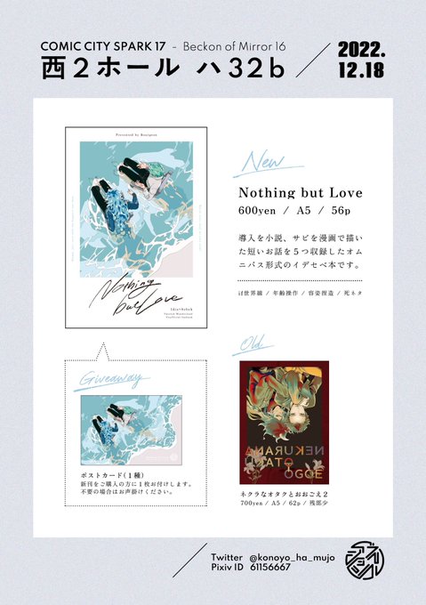 📣お品書き 12/18 スパーク17内 Beckon of the Mirror 16 西2ホール ハ32b イデセベで参加します😄🎶お隣のポピーさんと合体スペです!宜しくお願い致します〜〜🙋🏻♀️🙋🏻♀️🙋🏻♀️ 新刊サンプルはまた後日!