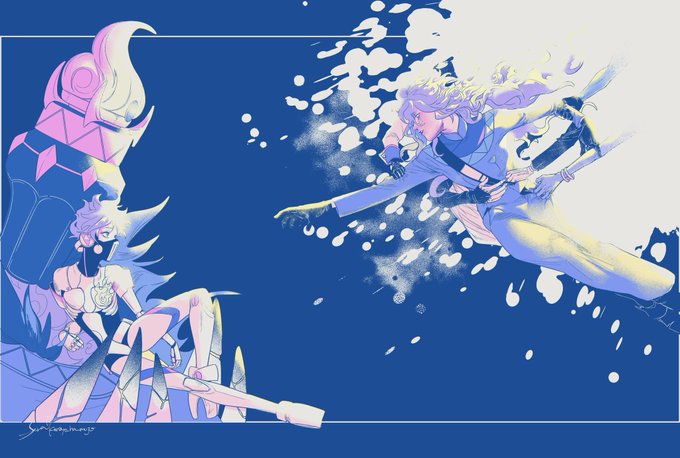 5 10 フォロワー合同誌に寄稿した門弥の合作カラーイラストです💁♀️ ワイは門を描きました✌️ これは没案のビックリマンverです 22/12/17 22:57