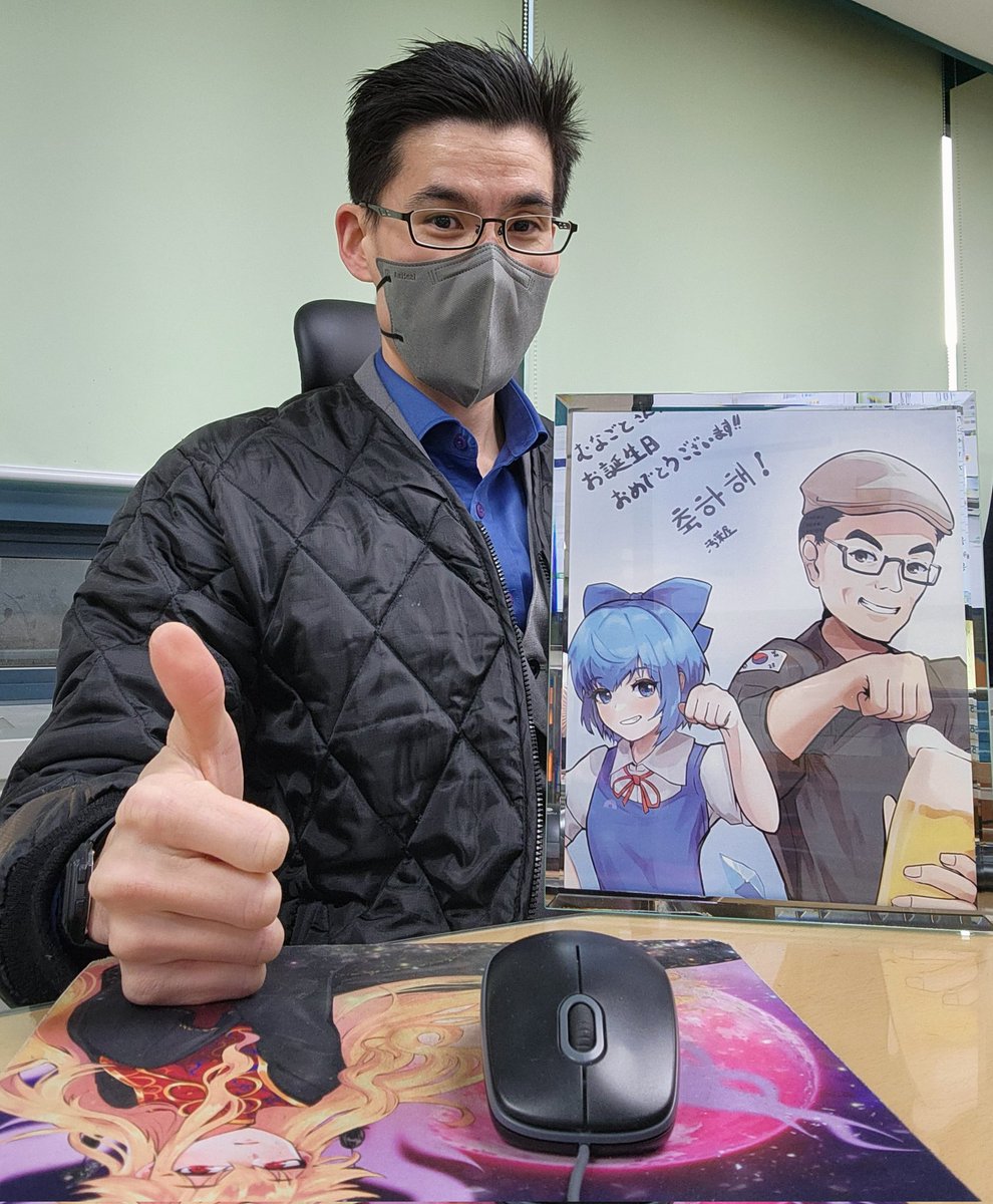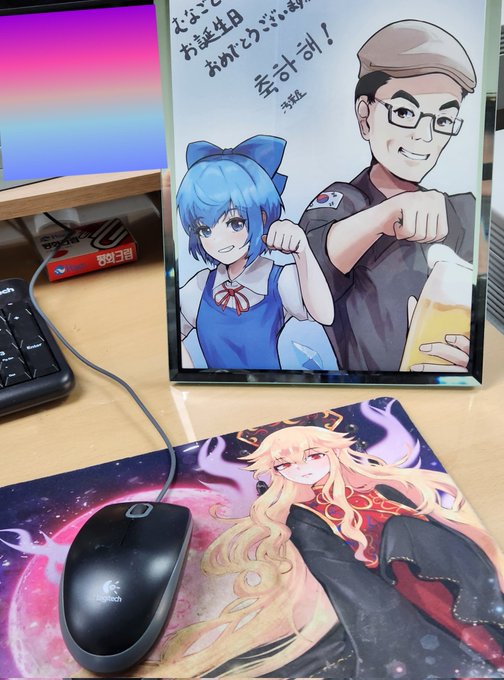 汚薬屋(@oekaki_no_aitu)さんからもらった誕生日イラストをプリントしてデスクに飾りました。 改めてありがとうございます。 #韓国の神主