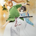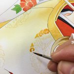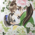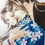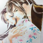 18 110 「蘭と葵」6巻カバー用カラー制作レポートその二。林蔵と蘭の着物の柄塗り。着物の柄と同じ花模様をバック用に別に描きました。 19/05/24 08:49