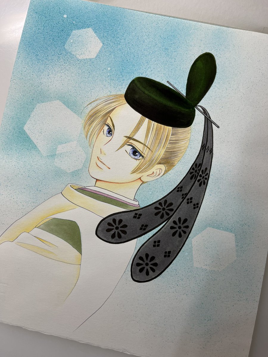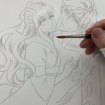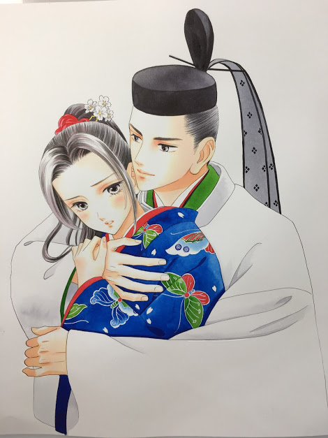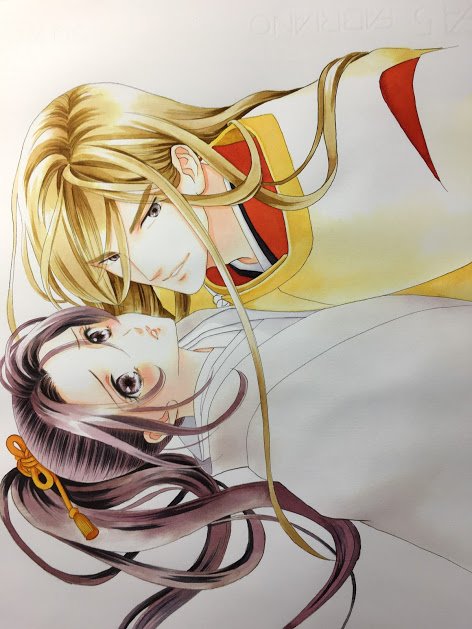 5 52 「蘭と葵」カバーイラストレポその3、なんやかんや完成に近づきました。帝の着物の柄は息を止めて描き入れます。 18/11/22 09:15