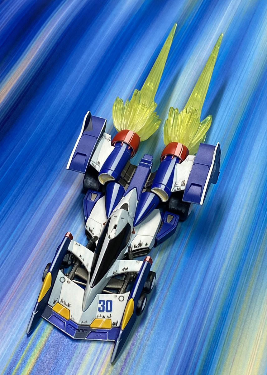 VAKITイシュザーク完成。 ガンプラ凄技テクニックを見て始めたイラスト風塗装3部作の3台目。先の2台と同様にブースト作動時のエフェクトパーツを追加しました。 #ガンプラ凄技テクニック #イラスト風模型 #サイバーフォーミュラ