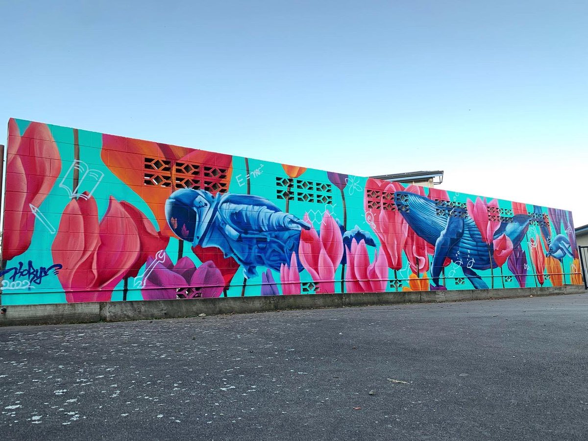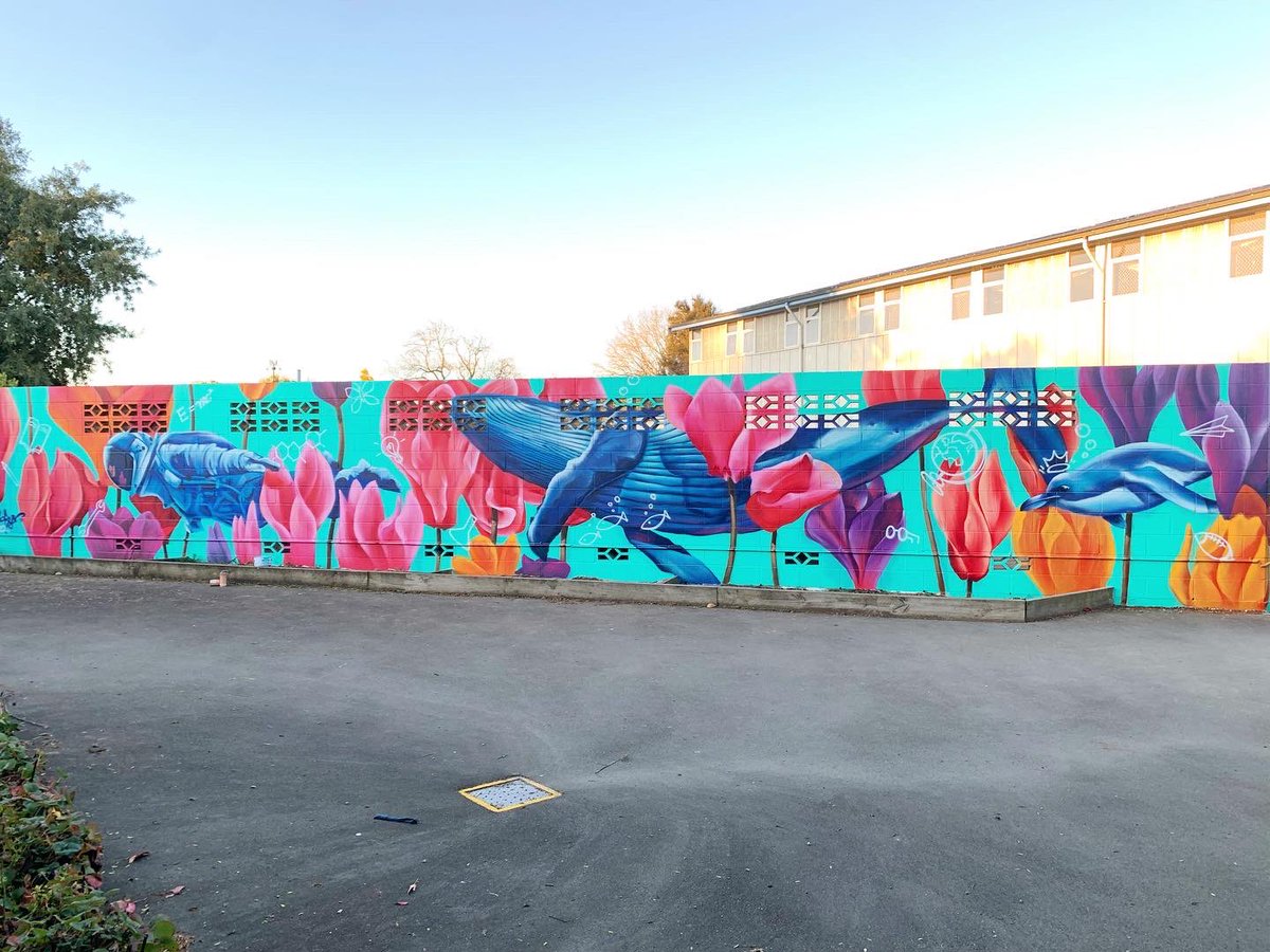 【完成】 Mural at Geraldine High school "キミが思い描く素敵な世界を生きよう" 学生たちが日々生活する学校という空間のなかで、明るくポジティブな未来を想像してもらえるような壁画を目指して描きました 日々学生さんたちに声をかけて頂けてとても嬉しかったです🙏