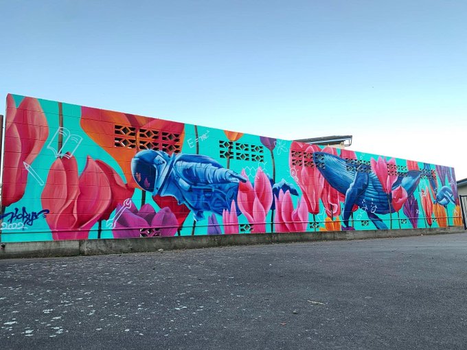 5 48 【完成】 Mural at Geraldine High school "キミが思い描く素敵な世界を生きよう" 学生たちが日々生活する学校という空間のなかで、明るくポジティブな未来を想像してもらえるような壁画を目指して描きました 日々学生さんたちに声をかけて頂けてとても嬉しかったです🙏 22/05/22 18:34