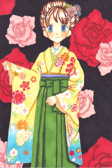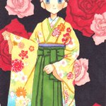#過去作で自分が最高だと思う絵を1枚載せて5rtを目指せ 自称最高がまさかのアナログですが、メイキング見て塗った振り袖のグラデーションと背景の薔薇と黒のコントラストが最高に気に入っております🤤✨二分の一成人式か小学校の卒業式のイメージで😌