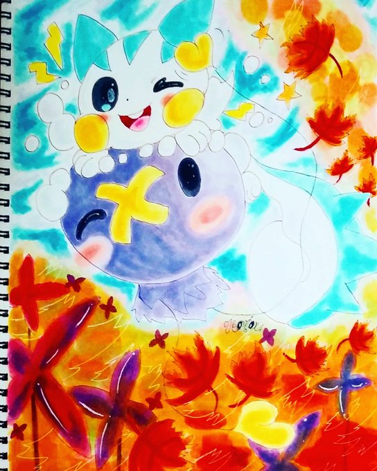 9 46 パチリス×フワンテ パッとしない色合いになってしまった、、でも初描きにしては割と良いかな~ #コピック 21/09/05 19:47