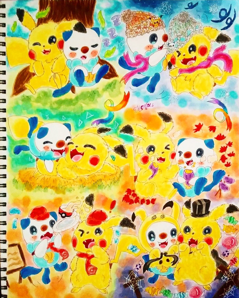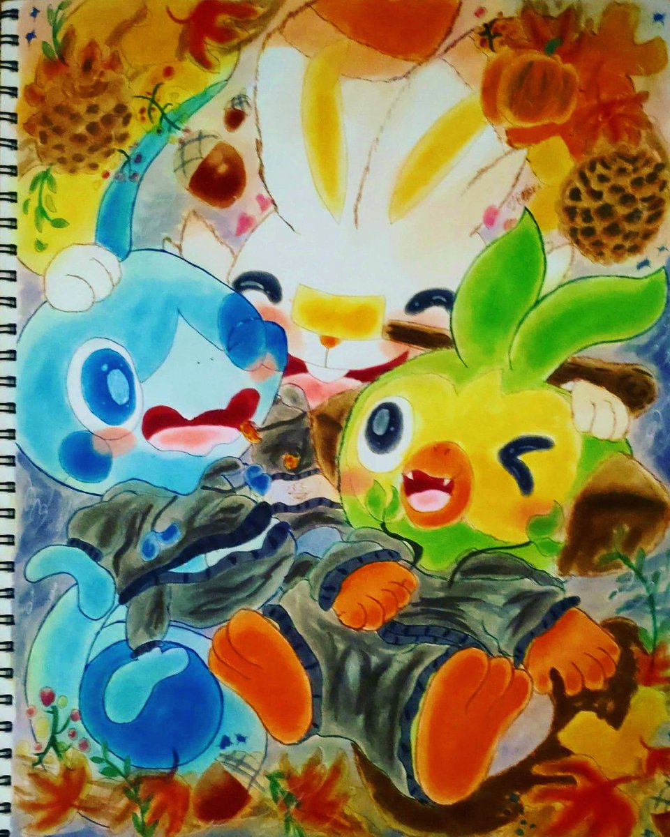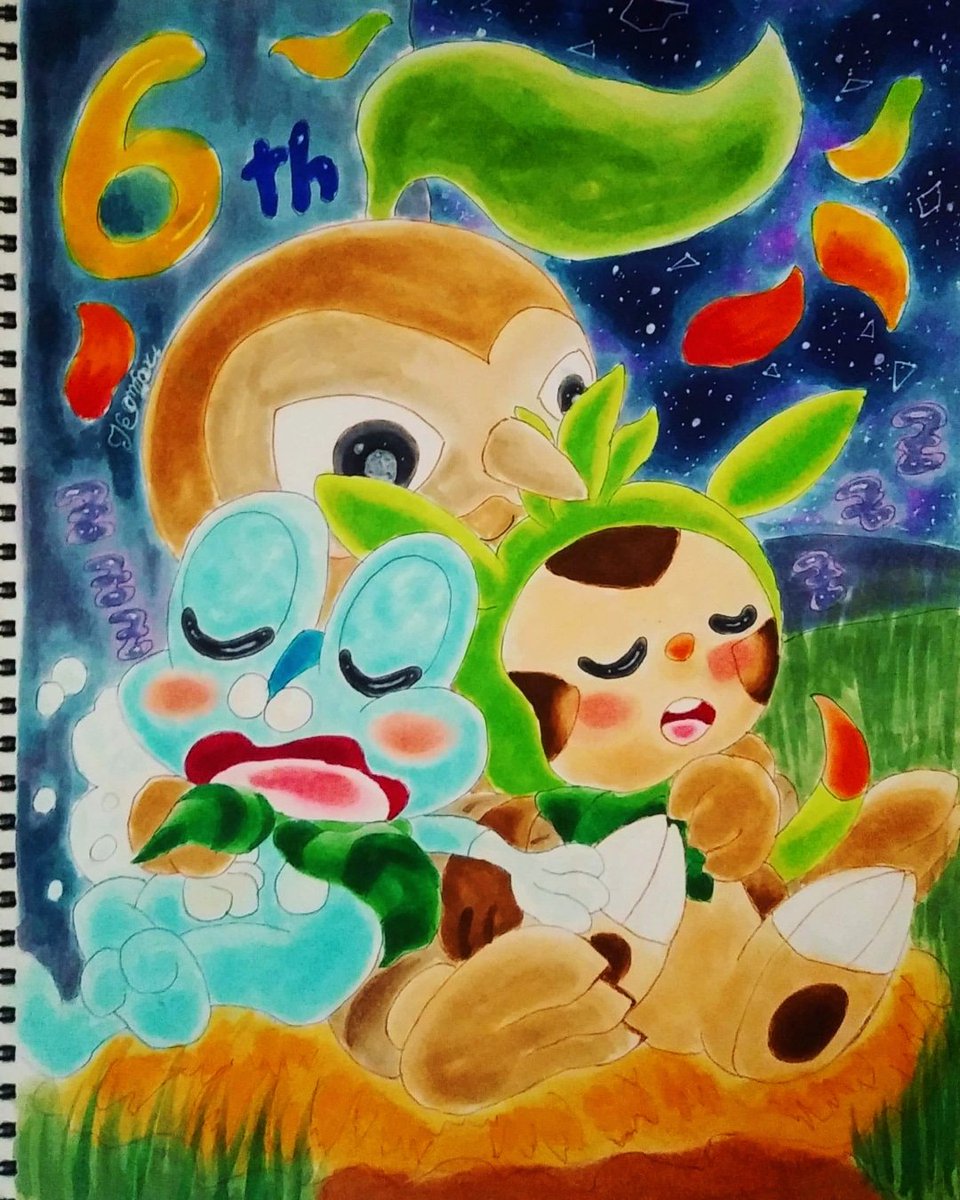 22 82 #ポケモンXY8周年 #コピック 毎度のごとく遅刻すいません〜お菓子食べてる御三家。本当にこの3匹可愛い 21/10/13 16:55