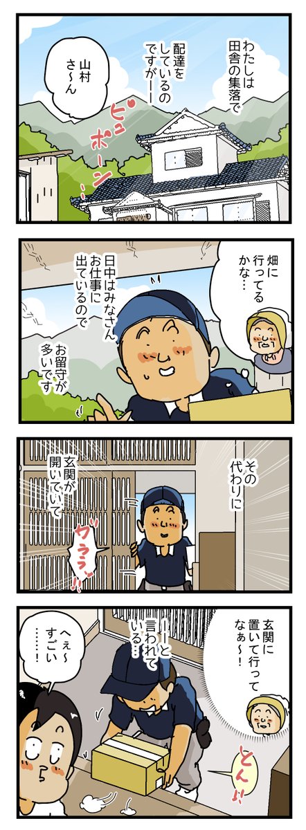 『田舎の宅配便では、このくらいは当たり前らしい、、』田舎の家はあまり鍵をかけないらしいですね、、 #宅配便 #コミックエッセイ #リアル宅配便日記 #漫画が読めるハッシュタグ ブログはこちら↓ ameblo.jp/yukitanoyonkom…
