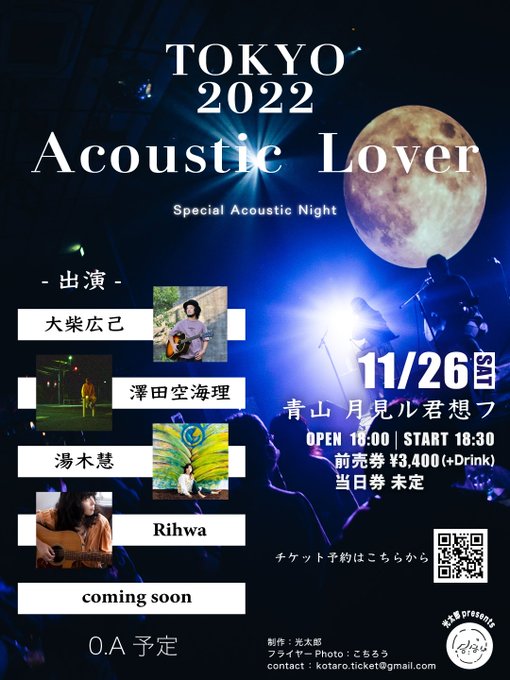 🌞解禁のイベント🌞 11月26日 土曜日 光太郎presents 「 Acoustic Lover TOKYO2022 」 - 出演 - 大柴広己 澤田空海理 湯木慧 Rihwa Coming soon... 会場 月見ル君想フ OPEN 18:00/START 18:30 チケット予約はコチラ ※10月17日21時より受付開始 tiget.net/events/209322
