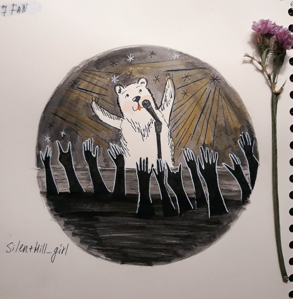 Вчерашняя тема-Fan Михаил Сергеевич всегда хорошо пел, это отмечали все, кто его знает.Но всегда же ему было страшно выйти на сцену, даже в караоке, не говоря уже о чем-то большем. Зато в снах страх исчезал и он видел себя на сцене перед сотнями фанатов. #inktober2021