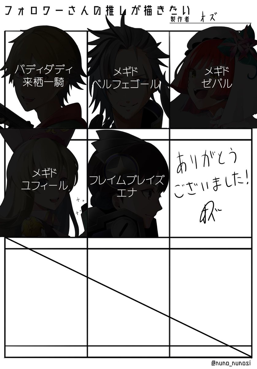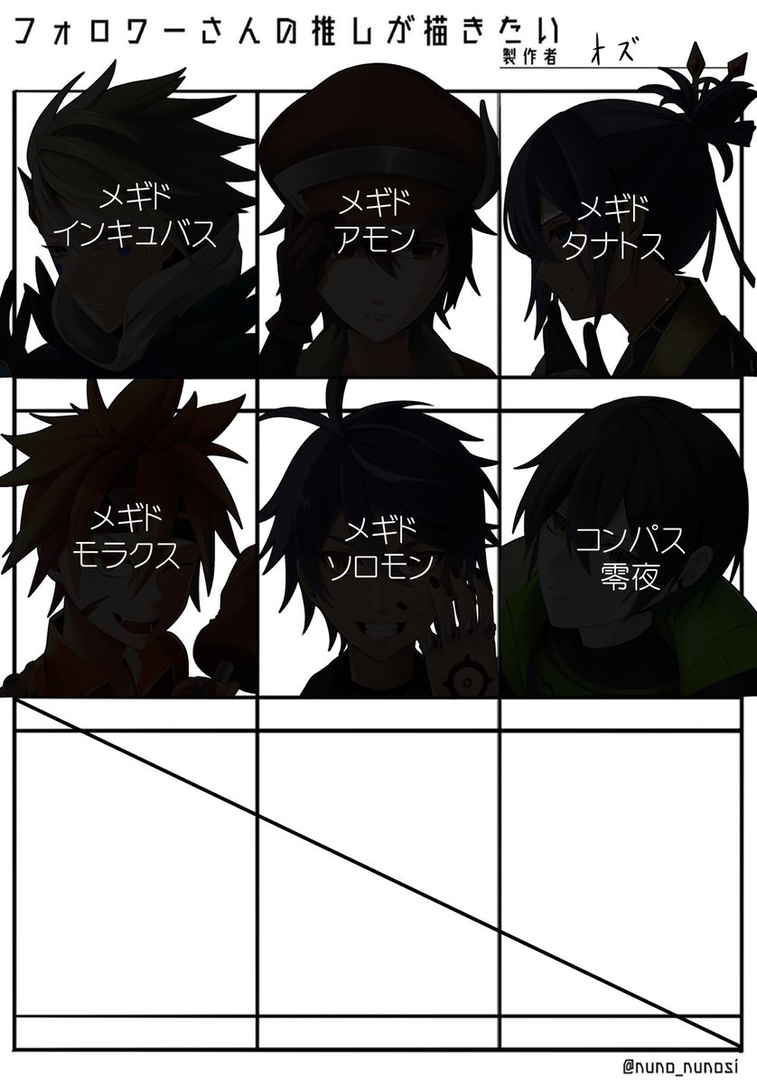 #〆ギドクラスタと繋がりたい #メギドクラスタと繋がりたい 4節更新と同時にやろうと思ってたけど普通に出遅れました! 普段はお絵描きしたり語彙力がなくなったりしてます!祖20、祖51、真16関係のツイが多いです^^; お絵描きは描きたいキャラを気が向いた時に描いてます〜!