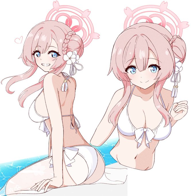 ブルアカより水羽ミモリ ミモリ(水着)実装記念 白ビキニと透けてるパレオ、シンプルに良い… あと広告で先行公開されたメモロビが神すぎる…引きたい… #ブルーアーカイブ #BlueArchive