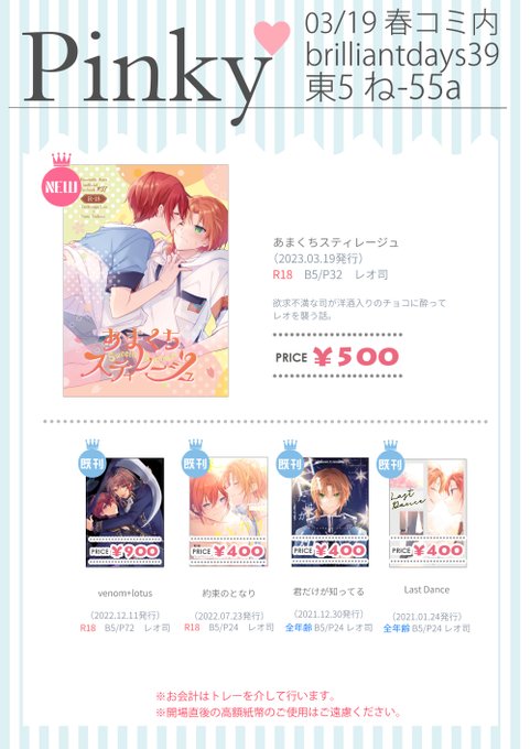 7/30ブリデ王桜お品書きpixiv.net/artworks/11029… お品書き上げました!卓上全部レオ司です~ ペーパーラリー用の無配は鋭意制作中… 何かしらは絶対用意しますが、どうなるかは未定です!😂