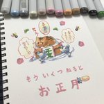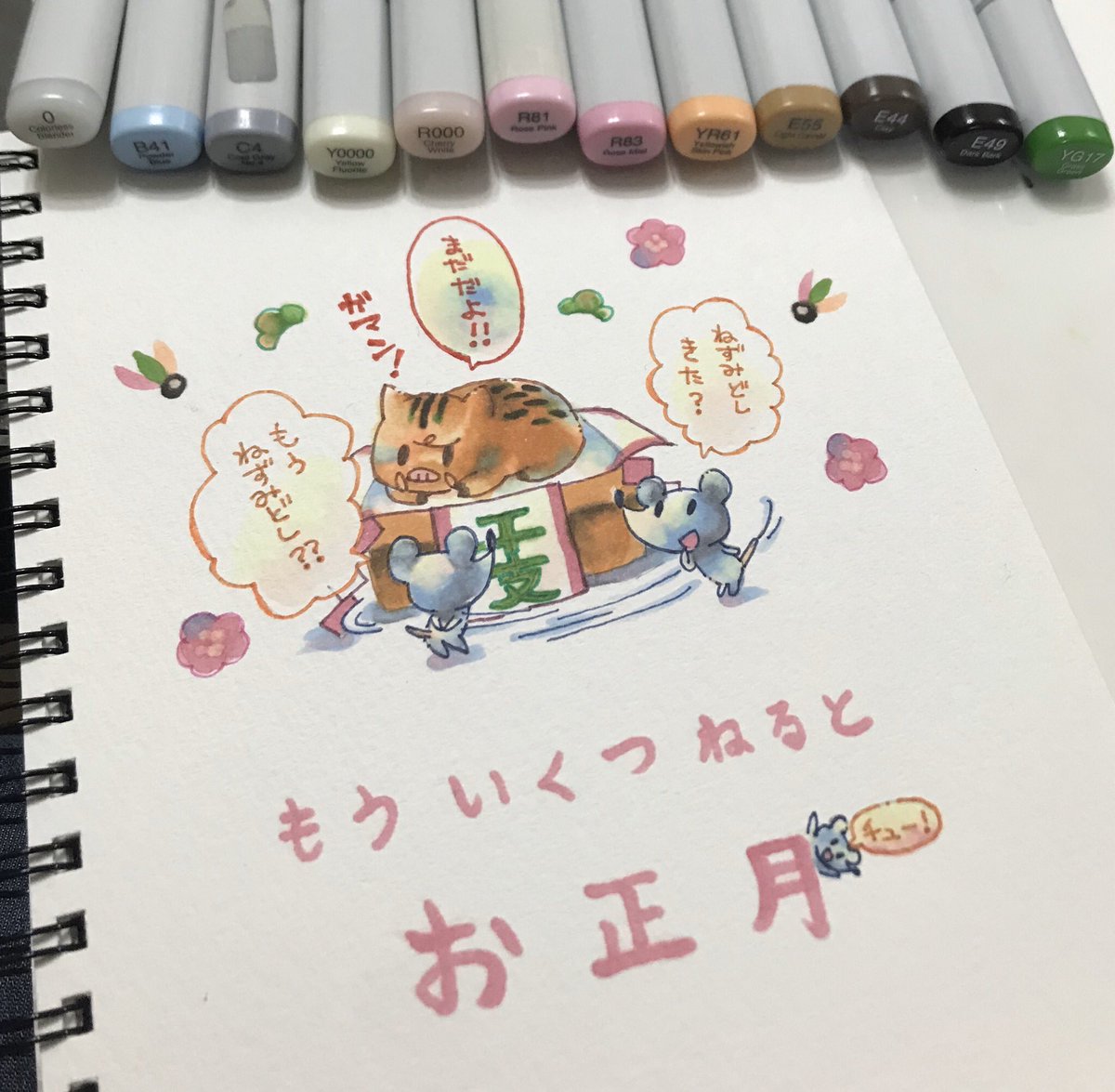 #コピックツインズ企画 参加させていただきます! 年賀状作った時に使った色がちょうど12色だったので、お正月を待ちきれないねずみの絵を描きました! 参加したかったので間に合ってよかったー! 良いお年を!!!
