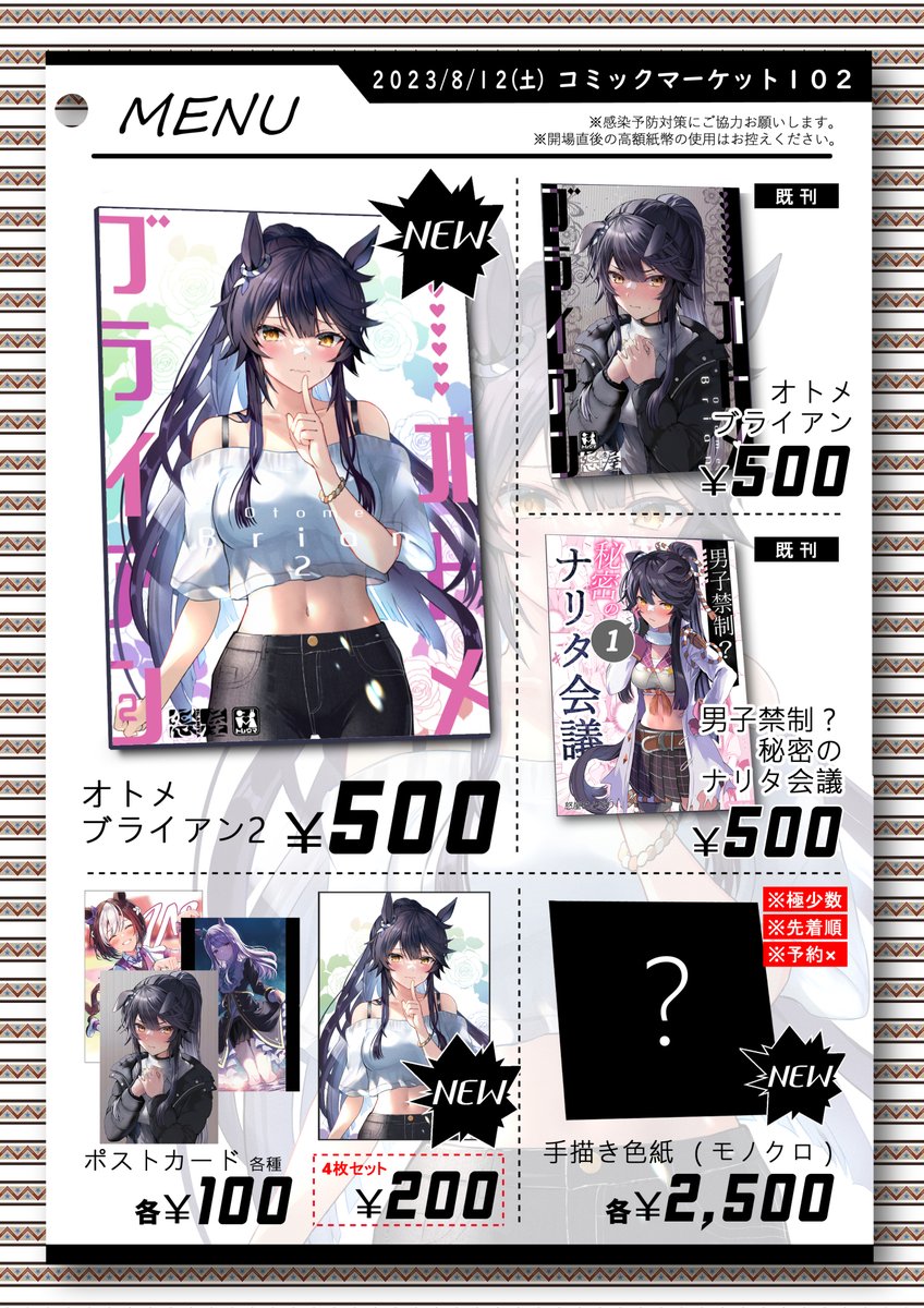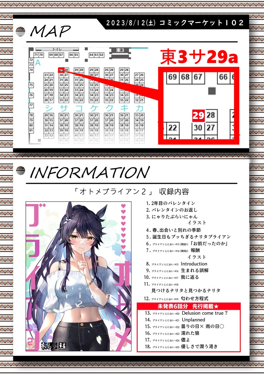 8/12(土) 【東3ホール サ 29a】 夏コミ(コミックマーケット102)お品書きです!今回の本もブライアンたくさん詰まっています。既刊も持っていきますのでこの機会に是非! 売り子は壱瑠さん(@ichiru_02 )にブライアンの衣装でお願いしています。 是非お越しください〜!🙌🙌 #C102 #C102お品書き twitter.com/i/web/status/1…