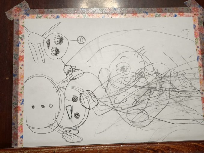 息子がお絵描きしたいと言ったので…コピー用紙を渡そうと思ったけど1歳児にコピー用紙渡したらやばそうだったのでマスキングテープで固定 わたしが雪だるま描いたのを真似して描いたみたい〜 #絵描きさんと繋がりたい