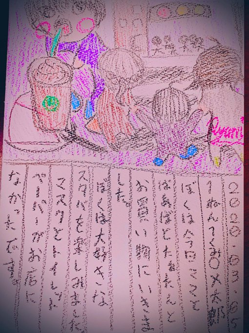 小学1年生の気持ちになって小学1年生のクォリティで描いてみました〜 #絵描きさんと繋がりたい 「2020.03.05 1ねん1くみ ◯×太郎 ぼくは今日ママとばぁばとたぁたんとお買い物にいきました。ぼくら大好きなスタバを楽しみました。マスクとトイレットペーパーがお店になかったです。」