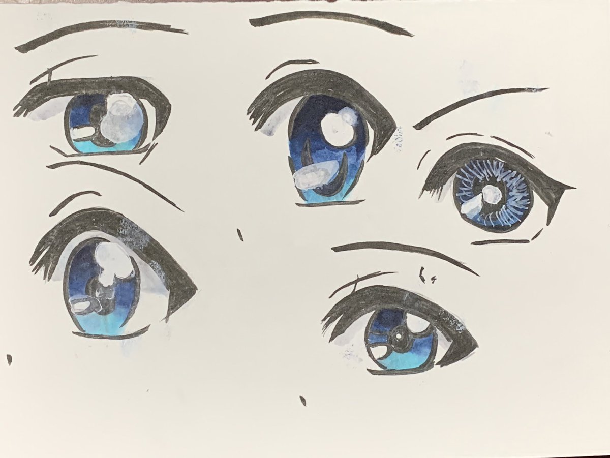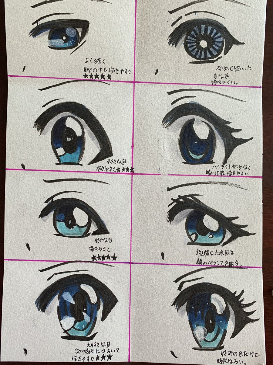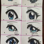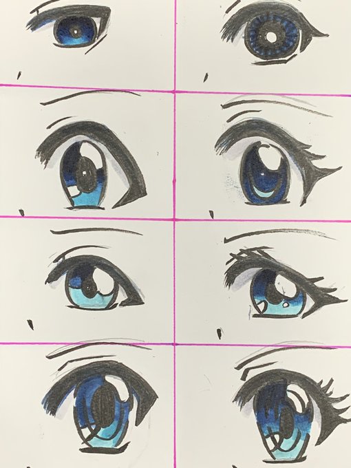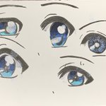 どのタイプの目にしようか考えてました。 今のところ右下から2つ目を予定中 個人的には1番下の目が好きだけどとあるユーチューバーさんが昔の目って言ってたから下から2つ目にすることにした的なw 相変わらずホワイトを入れるとインクだだ漏れになる… #絵描きさんと繋がりたい