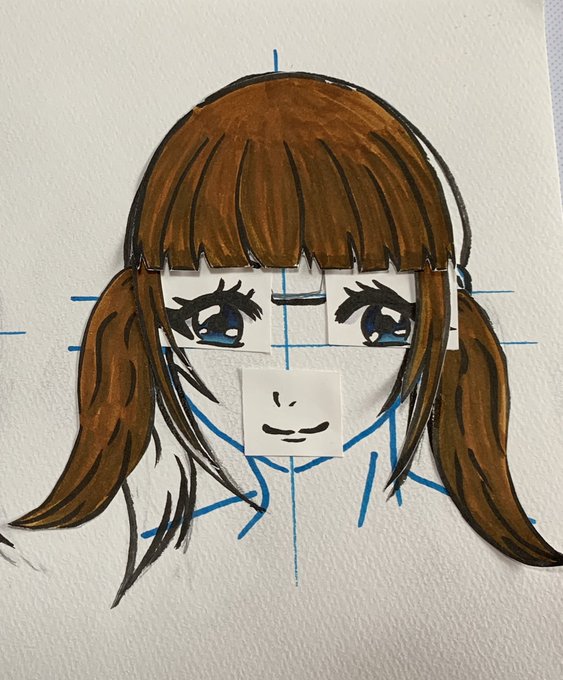 イメージしたパーツを配置してみる。 ・前髪ブロック ・サイドヘアブロック ・後頭部ブロック ・瞳と眉毛ブロック ・鼻と口ブロック と、土台の紙です。 旦那に福笑いと言われました…… #絵描きさんと繋がりたい #私の絵柄が好みって人にフォローされたい #私の絵が好みって人にフォローされたい
