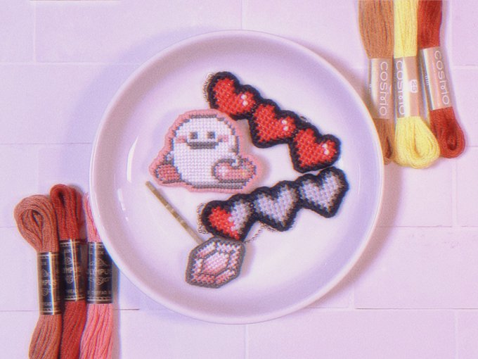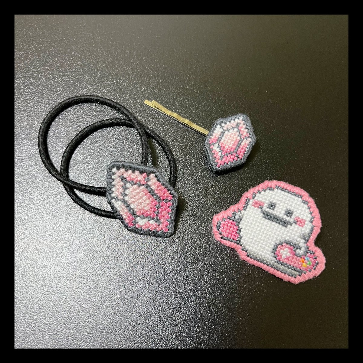最近作った、わい得クロスステッチを、わい得グッズに加工してみた( *¯ ꒳¯*) ヘアゴム、ヘアピン、ブローチです💎👻✨ かんわいいい⸜(* ॑꒳ ॑* )⸝❤🔥❤🔥❤🔥❤🔥 #クロスステッチ #8bit_shugei #pixelart
