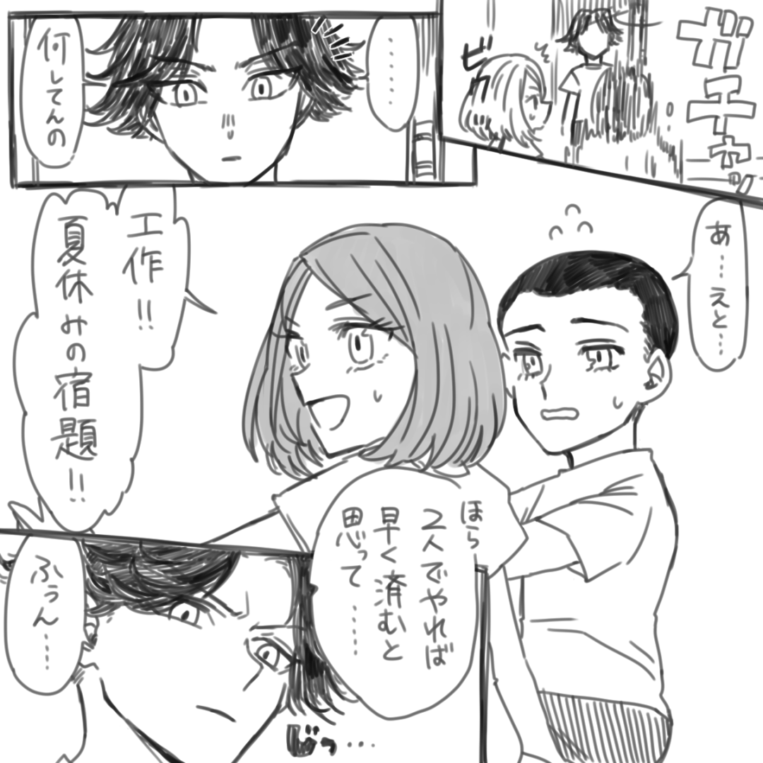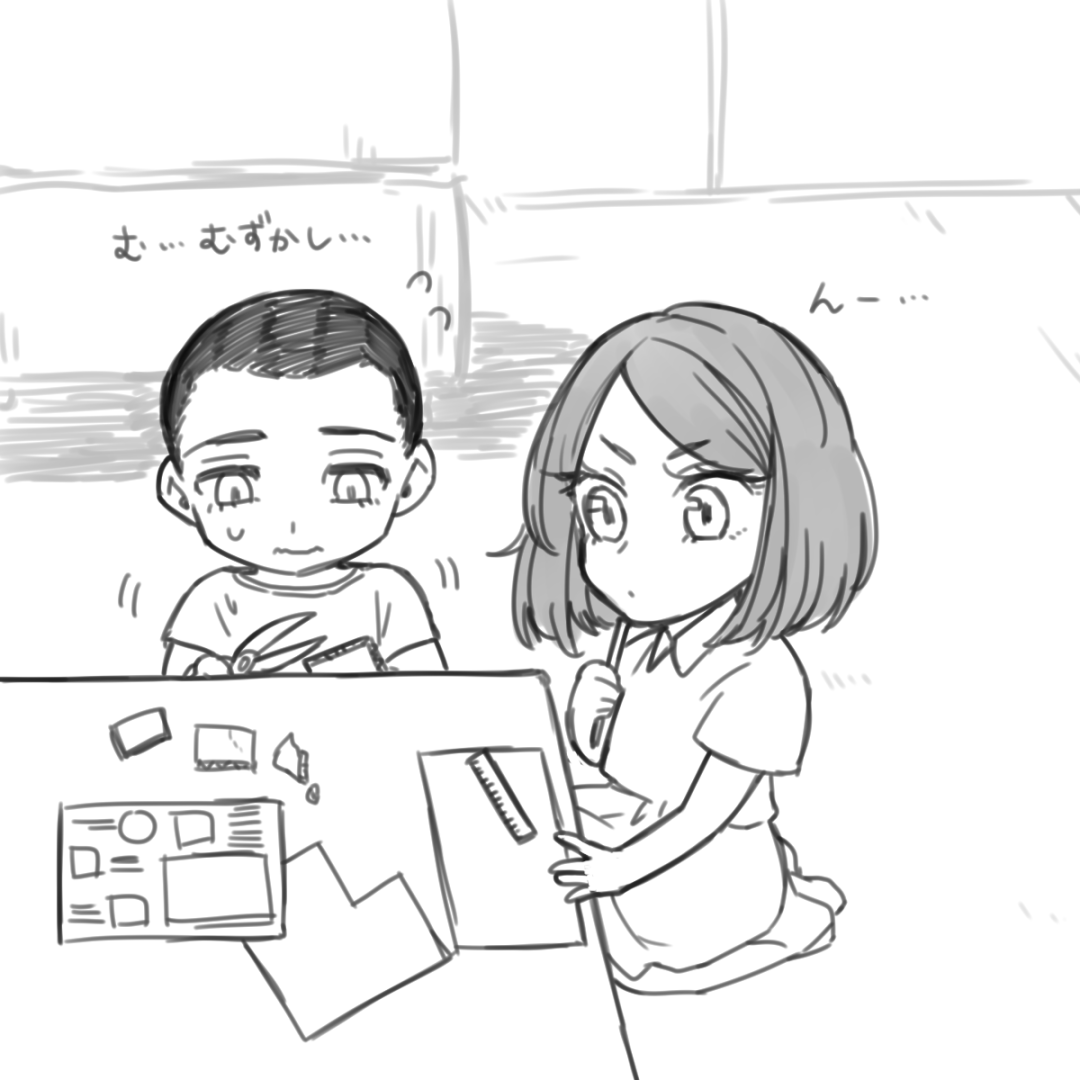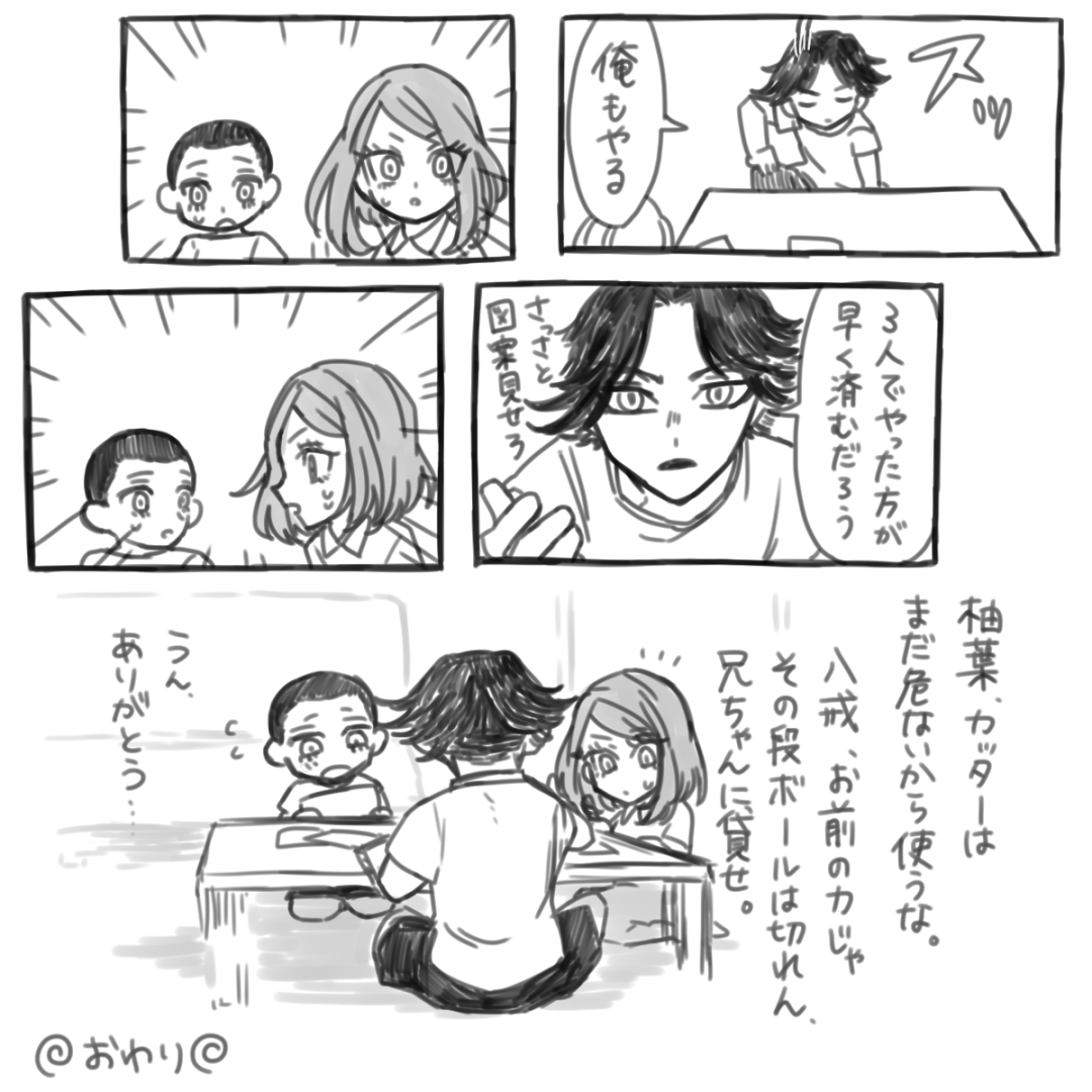 夏休みに一緒に宿題の工作にいそしむ柴家が見たいよ~~~!!と思ったので描きました。 珍しく長男が優しいです。