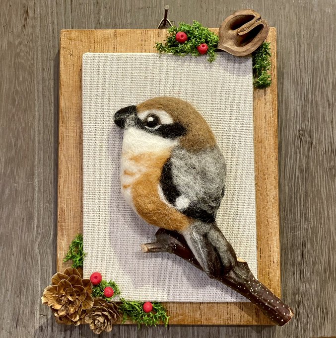 #居心地良い場所見つけた鳥ブローチの壁掛け #ヨーロッパコマドリ #羊毛フェルト #ハルコウヤ #森の額 #さのあんこ #コラボ作品 壁掛けのサイズ12×16センチ #コマドリ さんは羊毛フェルトのブローチ仕上げで簡単に外したり付けたり出来ます。 一緒にお出かけもできるし飾っておくこともできます。