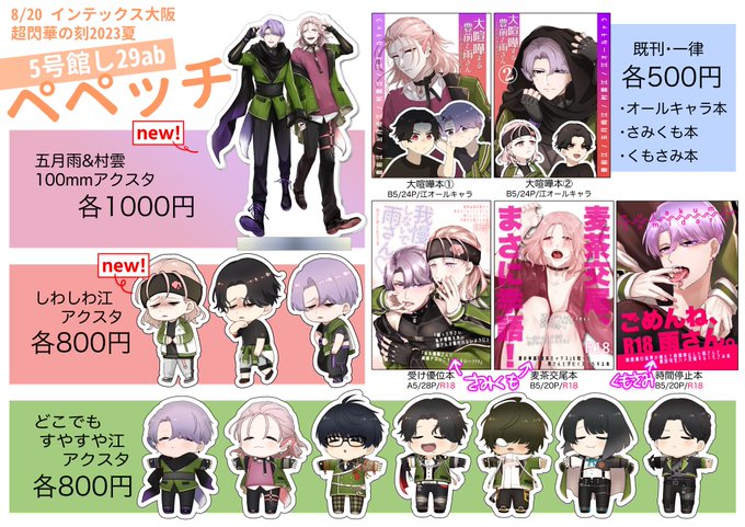 8/20 お品書き 【5号館し29ab ペペッチ】 新規はアクスタ2種です! 12時半から片付け→13時撤収の予定です ☔️コス予定なので13時以降はコスエリア遊んでます☀️ 売り子に🏍と☁️もいるよ〜〜!!よろしくお願いします!