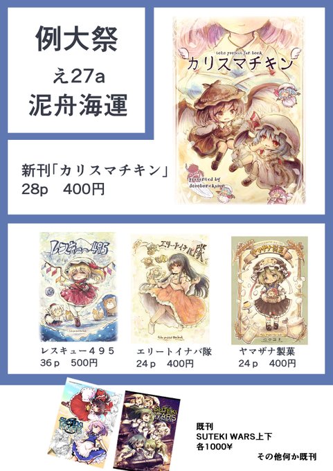 43 93 不安がいっぱい例大祭のお品書き。みすちーとお嬢様のささやかな新刊を「え27a泥舟海運」にて頒布しています 23/05/04 10:49