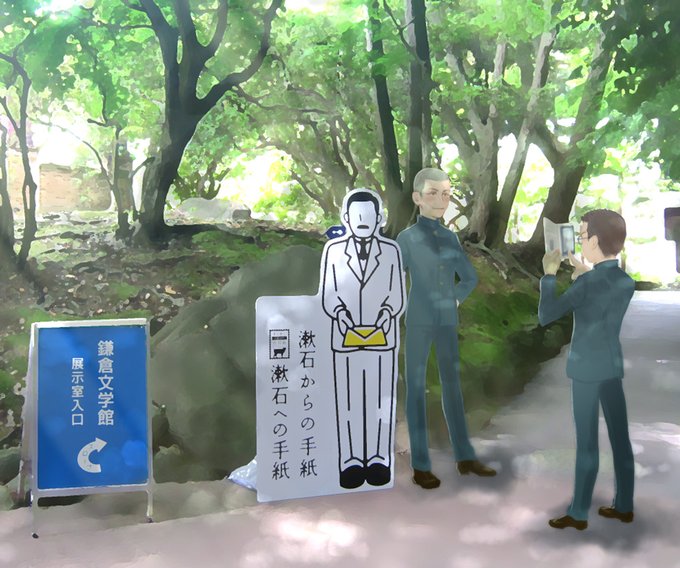 鎌倉文学館いつか行こうと思ったまま行けてない人〜! 鎌倉文学館さんがやってるのは3/26までで、そしたら2027年3月くらいまで休館だからー!! 行ってこーいい!! (画像は2017年の漱石立て看板と写真を撮る芥川と久米) kamakurabungaku.com