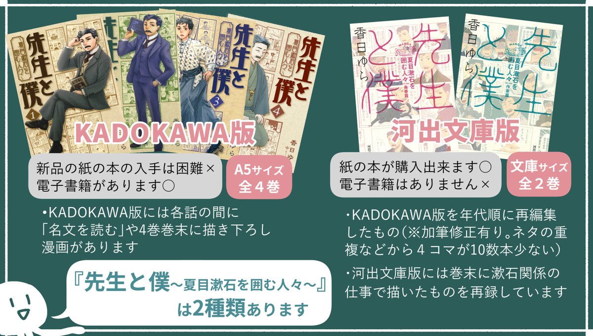 『先生と僕』は2種類あるけど何が違うの?をまとめました。 KADOKAWA版でも書店さんによっては置いていたり中古で入手できたりします。 河出文庫版はコミックコーナーではなく文庫コーナーの黄色い背表紙の河出文庫棚にあります。 twitter.com/kouhiyura/stat…