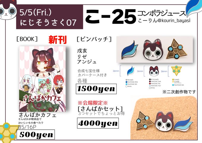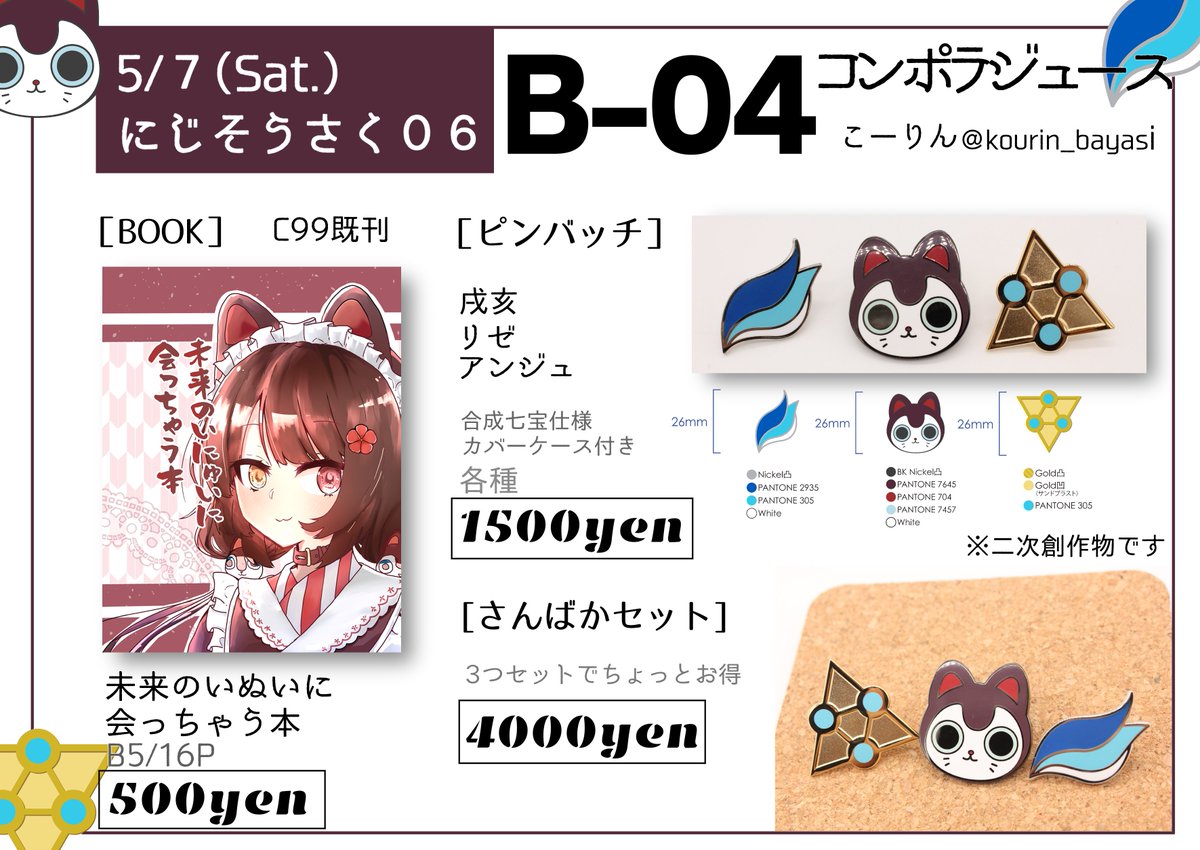 【5/7(土)開催にじそ06お品書き】 「B-04」コンポラジュースにてC99の既刊と新作の推しピンバッチだしますー!当日お待ちしています! #にじそうさく06