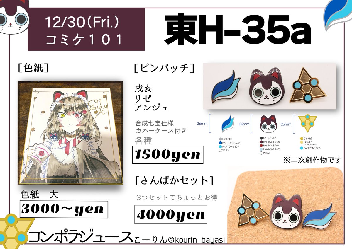 【冬コミ お品書き】 12/30(金)東H-35a 「コンポラジュース」 すみません!新刊落としました😭 当日はさんばかモチーフピンバッチと色紙持っていきます!間に合えば侘びペーパー刷っていきます… 当日はよろしくお願いします!👑⚖️🍹 #C101
