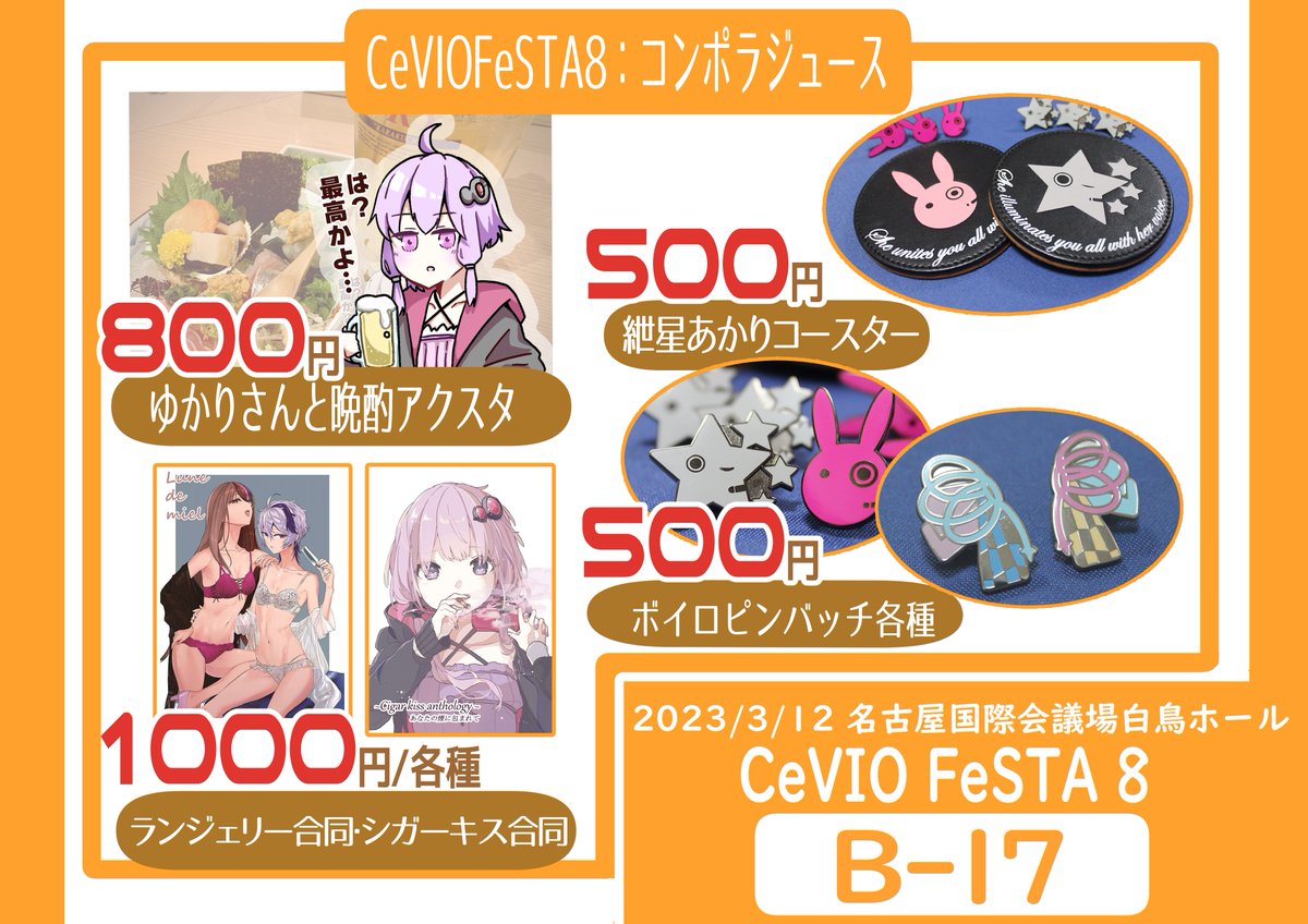 54 69 【B-17】 3/12㈰に名古屋白鳥ホールで行われる「CeVIOFeSTA 8」のお品書きになります! 新作はゆかりさんと晩酌できるアクリルスタンド! 委託で豪華メンバーによるシガーキス合同とランジュリー合同も頒布します!! 当日はよろしくお願いしますー! 【お品書き】 #ソウサミ #チェビフェス 23/03/10 20:43