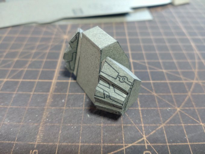 昨日今日で左腕と頭の一部出来た! 慌てて作っていたせいで、可動する部分を接着してしまった。まぁここまできたら仕方ないので、右腕の方で挽回します。 さーて、少し猶予貰えたけれど〆切まで間に合うかな!? #ペーパークラフト #papercraft #ジュノーン #ファイブスター物語
