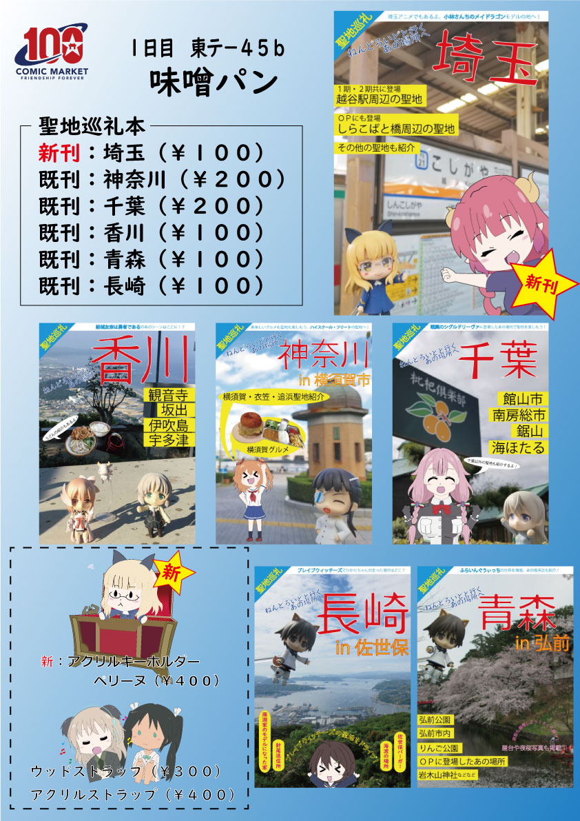 家庭の事情で見送るつもりだったが、なんとかなりそうなので申し込んでみだら・・・ あなたのサークル「味噌パン」は、コミックマーケット100で「土曜日東地区 "テ " 45b」に配置されました!コミケWebカタログにてスペース配置場所公開中です! webcatalog.circle.ms/Circle/Map/162… #C100WebCatalog
