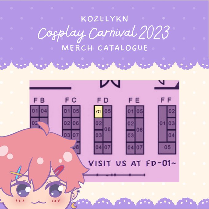 Hellooo!! I'll be attending Cosplay Carnival 2023!!! ✨✨Most of my merch are from Nijisanji, Genshin, Apex Legends and more. I'll be boothing with 3 wonderful artists so please do visit us!! We're located at FD-01 <3 #CosplayCarnival2023
