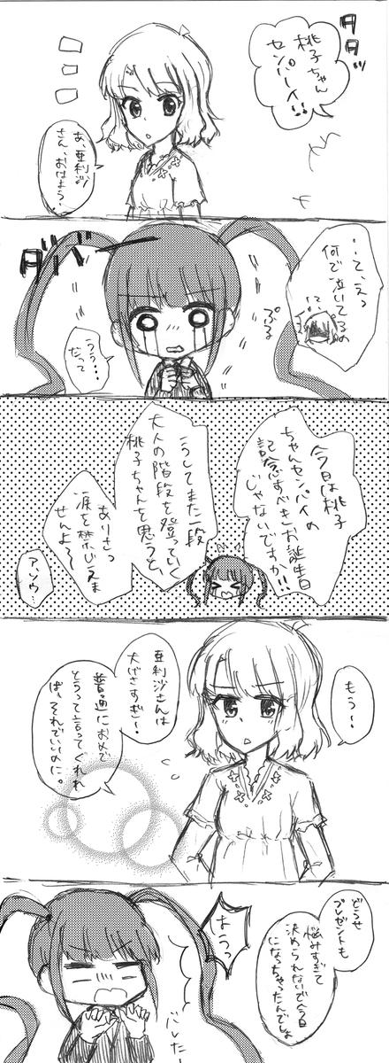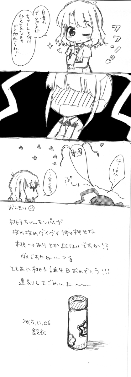 65 107 遅刻ですが桃子ちゃんセンパイお誕生日おめでとうございました~~~~~~ッ⌒(;ヮ;)⌒なももあり漫画。桃子→亜利沙です。鉛筆書きで汚いですが許してね。 15/11/07 01:20