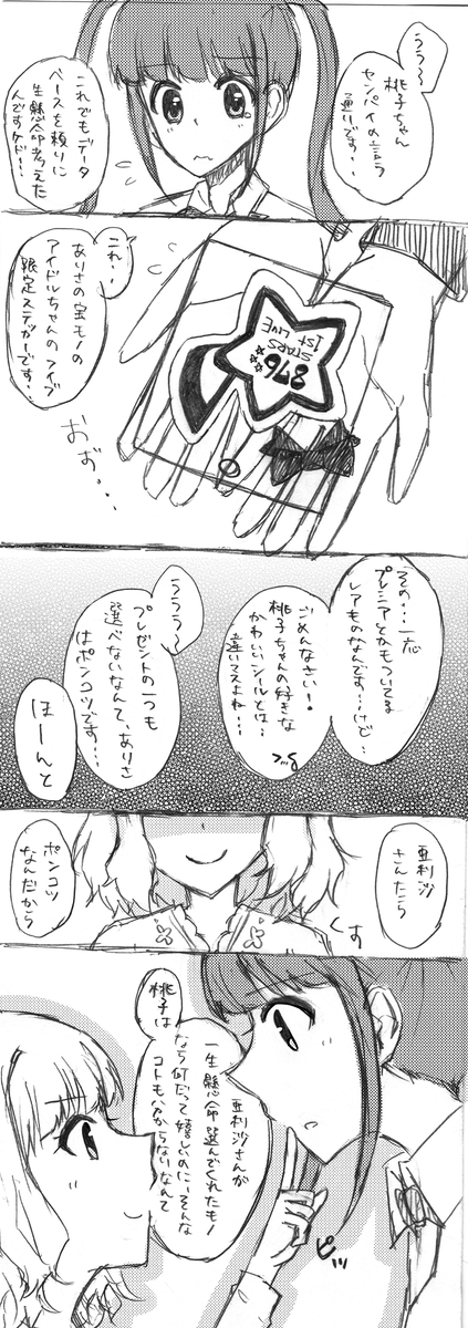 遅刻ですが桃子ちゃんセンパイお誕生日おめでとうございました~~~~~~ッ⌒(;ヮ;)⌒なももあり漫画。桃子→亜利沙です。鉛筆書きで汚いですが許してね。