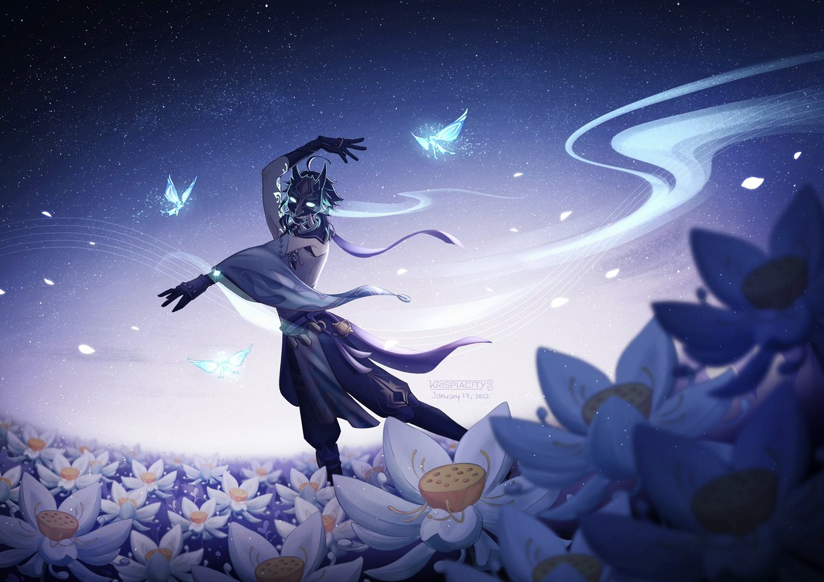 “He longs for a day to come when he will wear the mask and dance — not to conquer demons, but to the tune of that flute amid a sea of flowers.” #Xiao #GenshinImpact #fanart