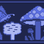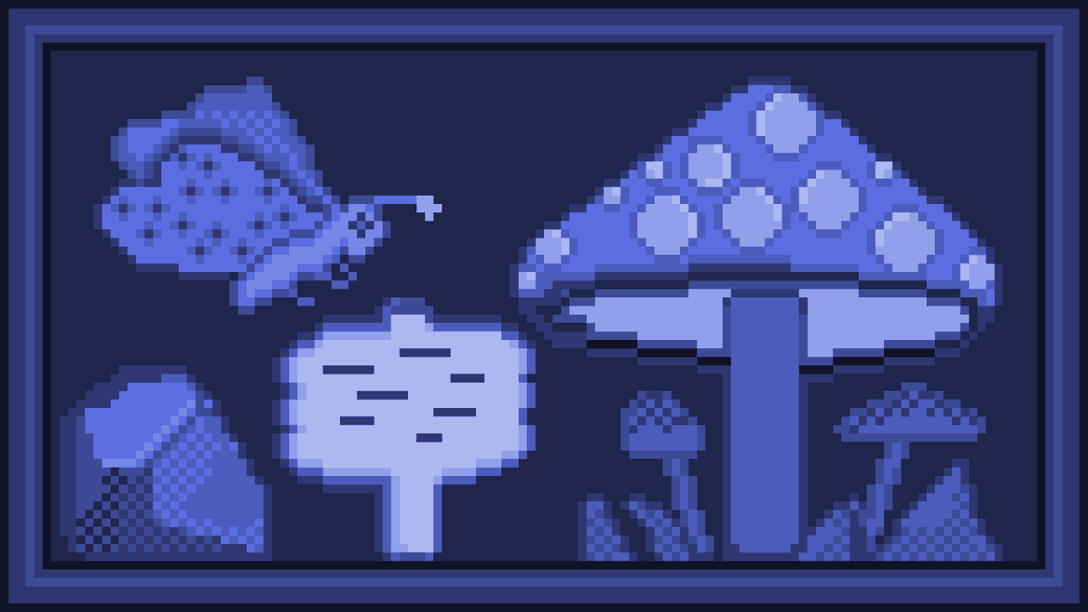 #ドット絵 青色で何か作りたいなーって思って、最初にキノコ作って、周りが寂しかったので、色々付け足してみた。 資料見てないから結構適当。 でも楽しかったです。 特に左下の岩…岩っぽく見えてればいいけど(/・ω・)/